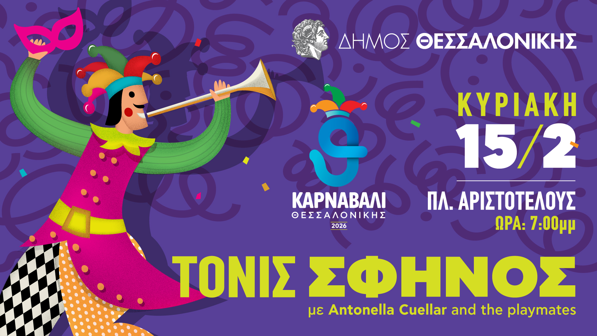Ο Δήμος Θεσσαλονίκης διοργανώνει μεγάλο αποκριάτικο πάρτυ με τον Τόνι Σφήνο, την Κυριακή 15 Φεβρουαρίου 2026, στις 19.00, στην Πλατεία Αριστοτέλους.